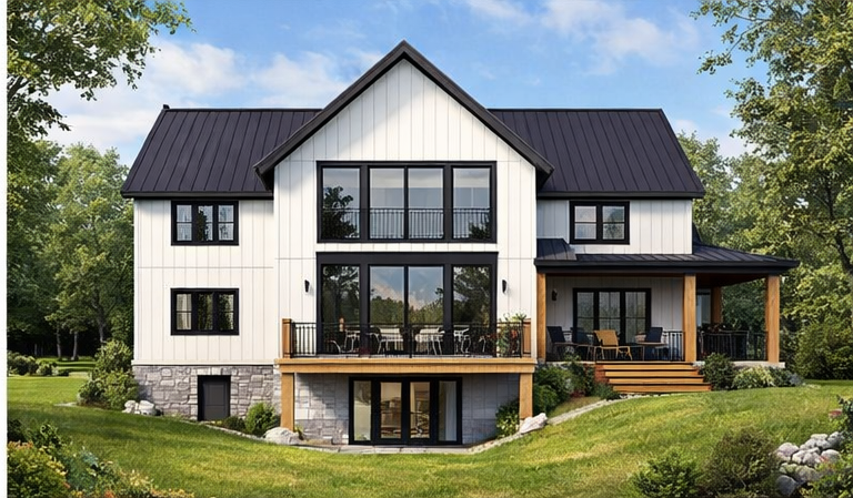 La façade arrière du plan maison Farmhouse moderne est pensée pour profiter pleinement de la cour, du boisé ou de la vue sur un lac. Elle favorise la luminosité et crée une transition naturelle entre l’intérieur et l’extérieur.