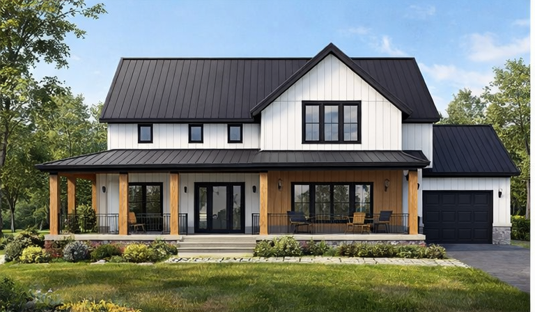 Cette façade avant met en valeur le caractère intemporel du plan architecture Farmhouse moderne, tout en s’intégrant parfaitement aux quartiers résidentiels du Québec, qu’ils soient urbains, périurbains ou en milieu rural.